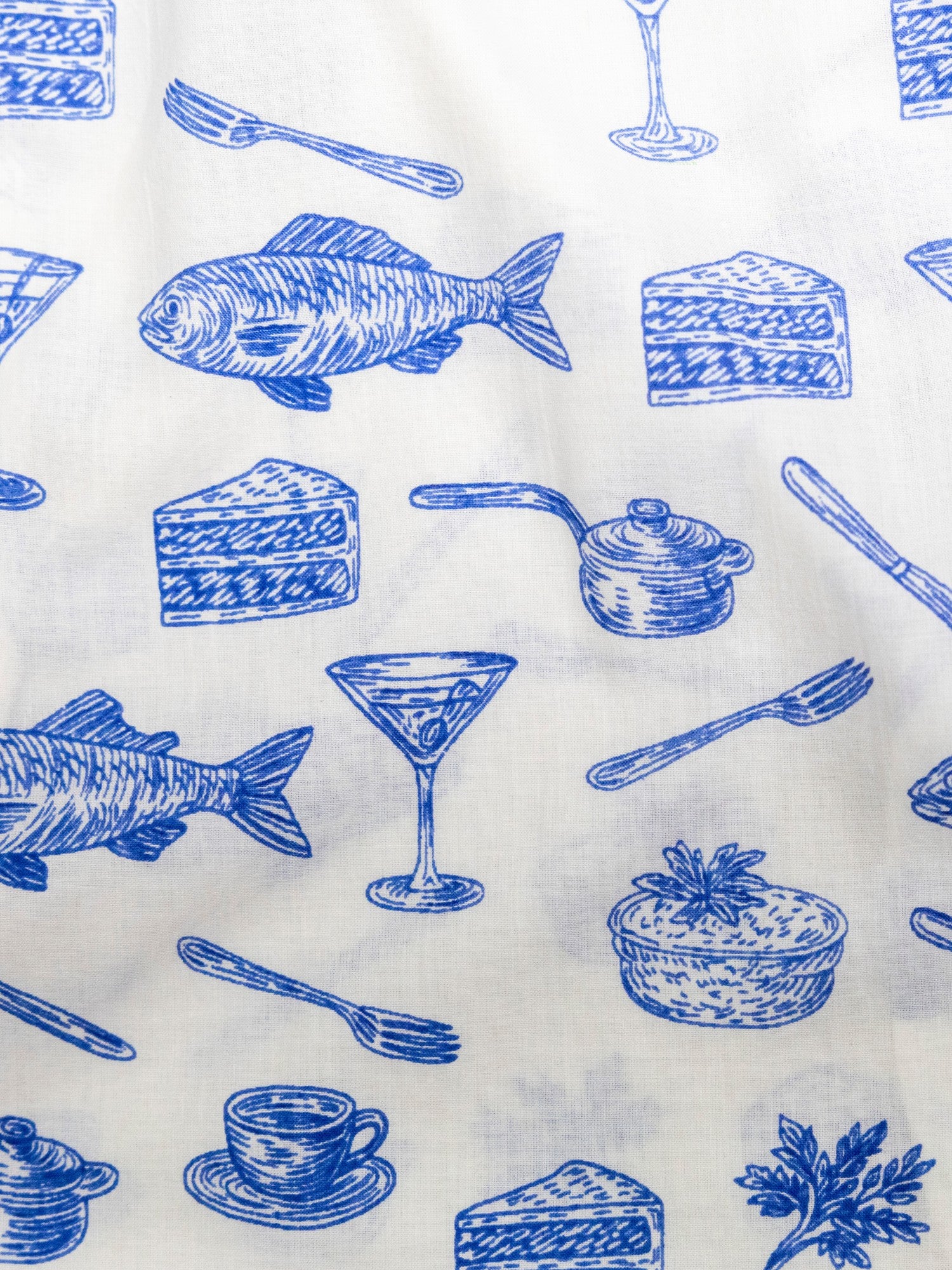 Handgefertigt in Jaipur, Indien, aus 100 % Bio-Baumwolle, zeigt Midnight Kitchen einen verspielten und zugleich eleganten Allover-Print in tiefem Blau auf weichem, weißem Grund. Das Muster nimmt Bezug auf traditionelle portugiesische Azulejo-Fliesen, Küchenobjekte und Essensmotive – eine liebevolle Hommage an gemeinsame Mahlzeiten, lange Gespräche und die Freude, zusammen am Tisch zu sitzen.